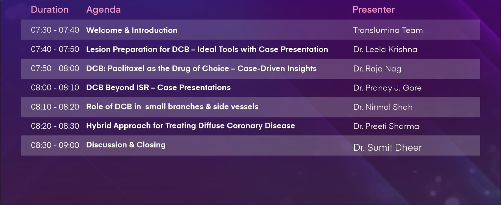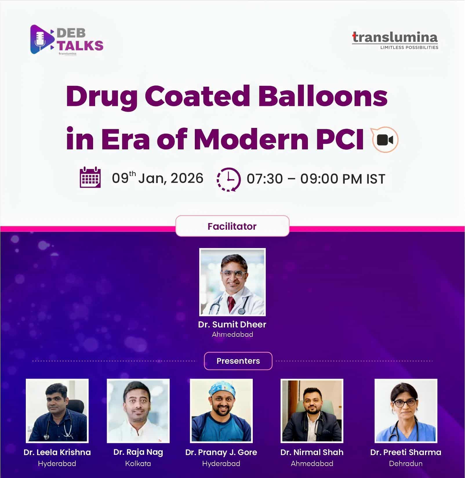 This educational event is intended solely for healthcare professionals only in Cardiology and is not for marketing or promoting any medical practice, use of medical practice, use of medicine, use of instrument or device. The session may be recorded and used for training; copyright remains with the Translumina Team. Attendee details may be used by the Translumina team for scientific follow-up. The scientific deliberation is independent of Translumina, and speakers may share clinical experiences that include off-label uses in all the countries where the sessions are being watched. Translumina team do not take any responsibility of the scientific accuracy or the clinical outcome of the discussions. TTPL disclaims any liability for video quality, internet disruptions, transmission issues, or IT connectivity.