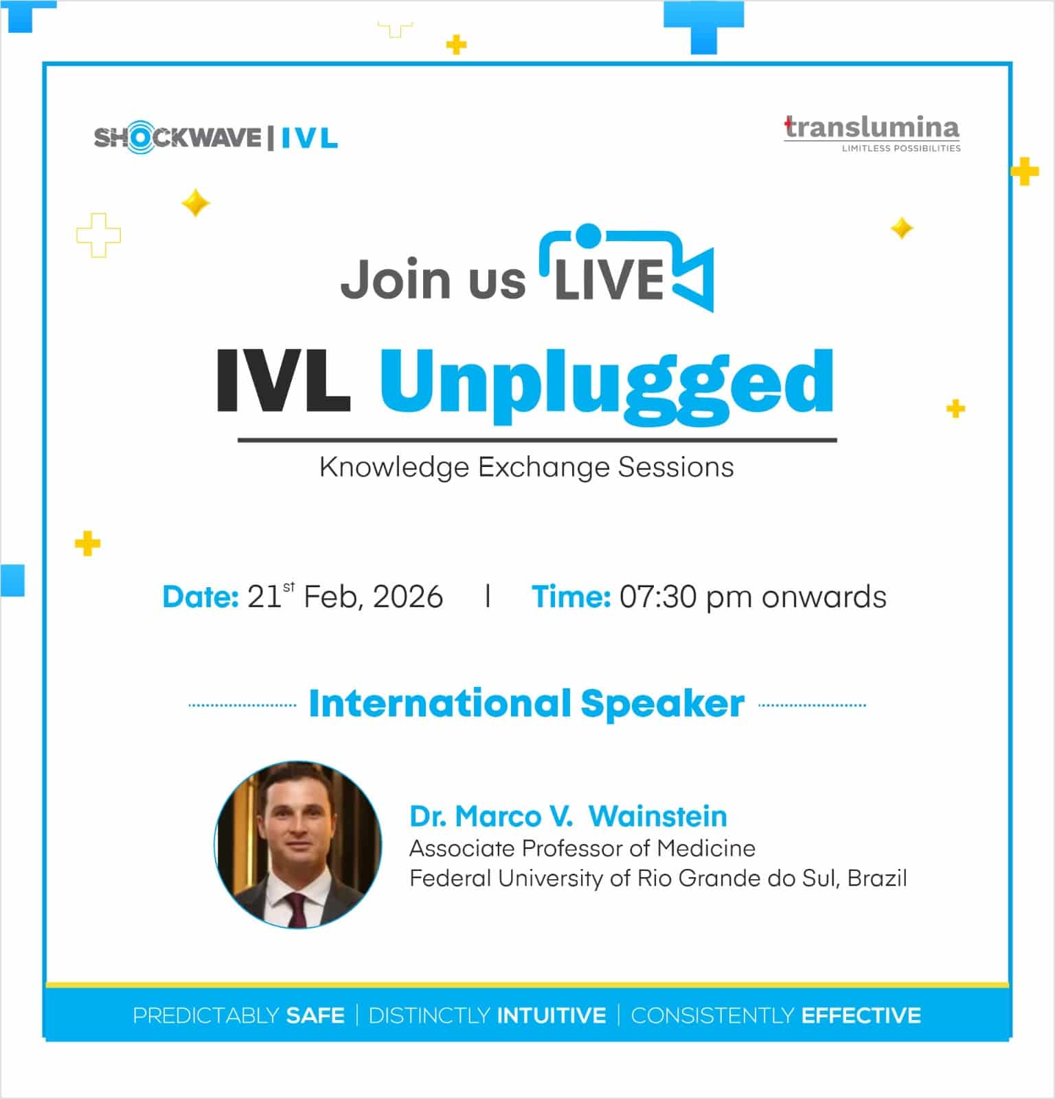 This educational event is intended solely for healthcare professionals only in Cardiology and is not for marketing or promoting any medical practice, use of medical practice, use of medicine, use of instrument or device. The session may be recorded and used for training; copyright remains with the Translumina Team. Attendee details may be used by the Translumina team for scientific follow-up. The scientific deliberation is independent of Translumina, and speakers may share clinical experiences that include off-label uses in all the countries where the sessions are being watched. Translumina team do not take any responsibility of the scientific accuracy or the clinical outcome of the discussions. TTPL disclaims any liability for video quality, internet disruptions, transmission issues, or IT connectivity.